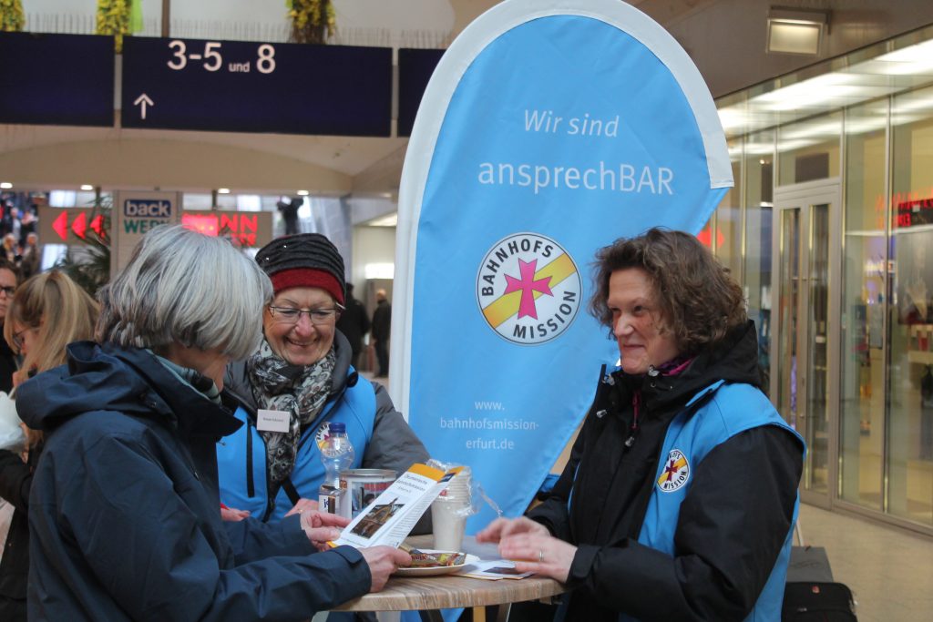 Als „Engel am Zug“ haben wir im Jahr 2017 am Erfurter Hauptbahnhof eine Ökumenische Bahnhofsmission gegründet. Darin unterstützt uns die Konferenz für kirchliche Bahnhofsmission (KKBM) und deren Bundesgeschäftsstelle in Berlin.